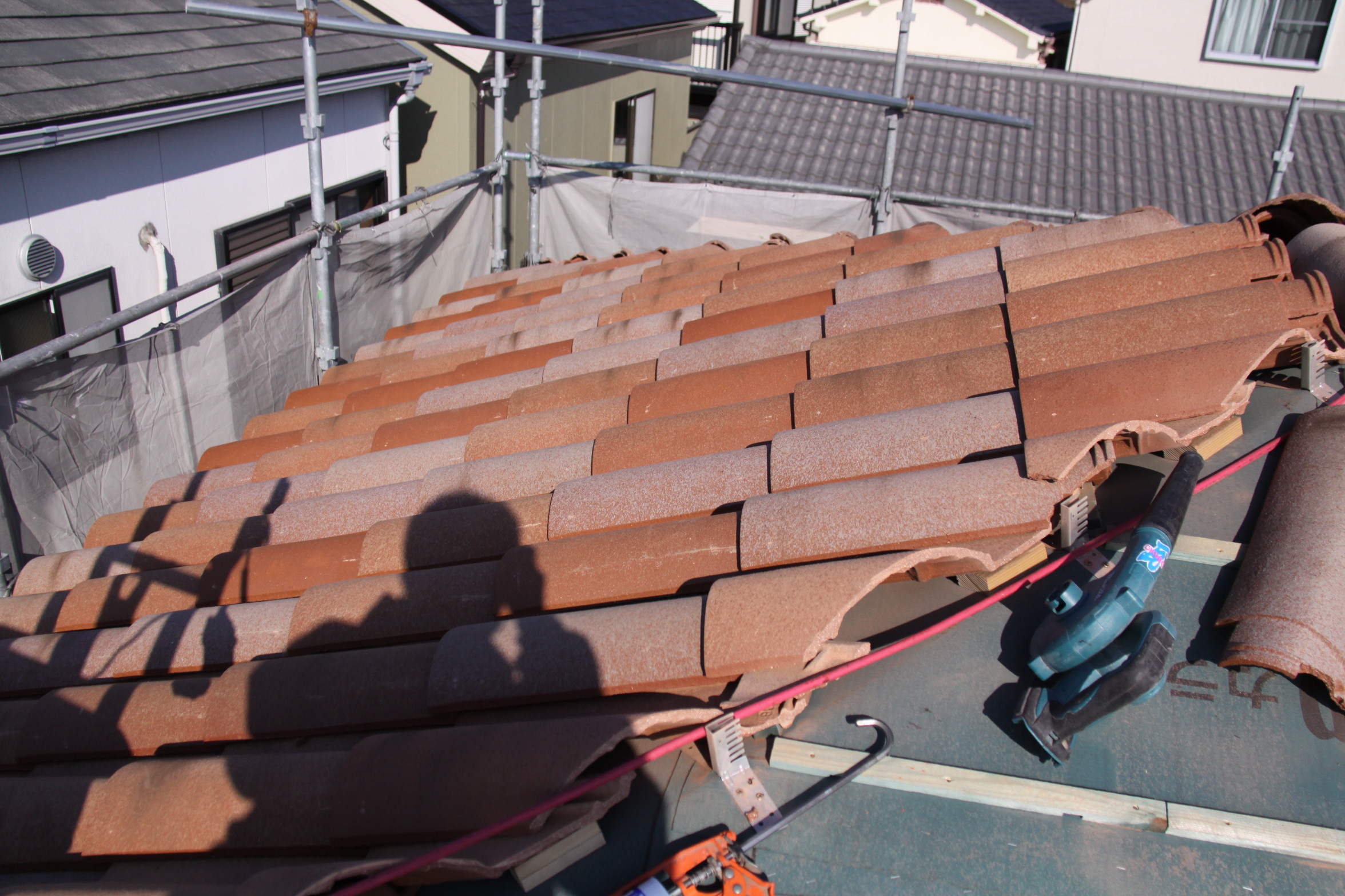既存の淡路産の釉薬瓦からフランス産のイメリス瓦に葺き替え中。