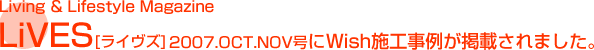 築80年以上、古い日本家屋の情緒を楽しむモダンライフと題して、LIVES(ライヴズ)2007年10月11月号にWISHの施工した事例(昭和元年移築 長坂寺古民家リノベーション)が掲載されました。